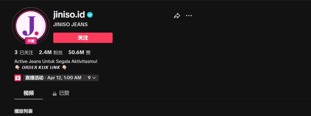 我们去浏览了一些印尼区的直播,一个印尼本土服装品牌 Jiniso 在 TikTok Shop 回归之后,马上恢复了直播。Dian Fiona 是印尼本地的服装商家,在大学期间创立了自己的牛仔裤品牌 Jiniso。Dian 最早将店铺开在印尼非常著名的线下服装批发市场 Tanah Abang,2019 年开始转向线上销售。在注册 TikTok 小店后,TikTok 带来的销售额快速上升,到今年 7 月,其总销售额的 50% 都来自 TikTok。