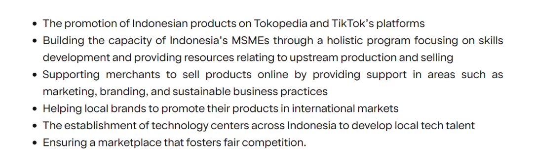 比如这里的“头”,可能到生产环节。TikTok 借 GoTo 发表的公告承诺了支持印尼中小微企业的具体措施,比如在印尼各地建立技术中心来培养当地技术人才、推出赋能中小企业的计划,向他们提供优化上游生产与促进销售的资源。