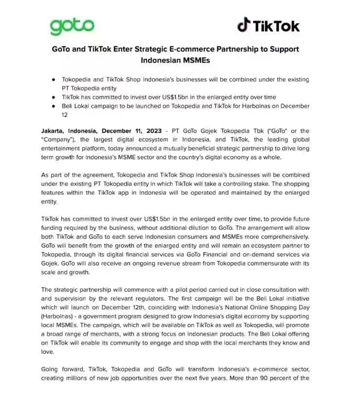 根据此次合作协议,TikTok 在 10 月份关闭的 TikTok Shop Indonesia 业务并入 GoTo 旗下现有的 PT Tokopedia 实体下,但 TikTok 将持有合并后 PT Tokopedia 75% 的控股权,双方的合并交易将在 2024 年 Q1 完成。同时,TikTok 还承诺未来会向 PT Tokopedia 投入超过 15 亿美金。