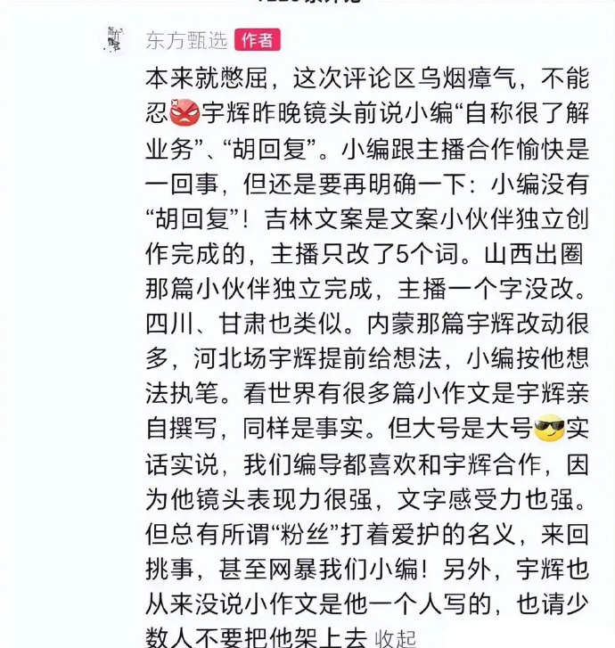 如果事情发展到这里结束也就没什么大不了,但“愤怒”的小编又又又直接在评论区开怼,认为自己没有胡回复,小编随后仔细列举每一场的小作文创作:吉林、山西、四川、甘肃场的文案团队均由文案团队独立创作完成。内蒙篇宇辉改动很多,河北场中,由董宇辉提前给想法,小编落实。“看世界”有很多篇小作文是宇辉亲自撰写,同样是事实。 自证清白后,小编随即将矛头转向粉丝:“总有所谓‘粉丝’打着爱护的名义,来回挑事,甚至网暴我们小编!”