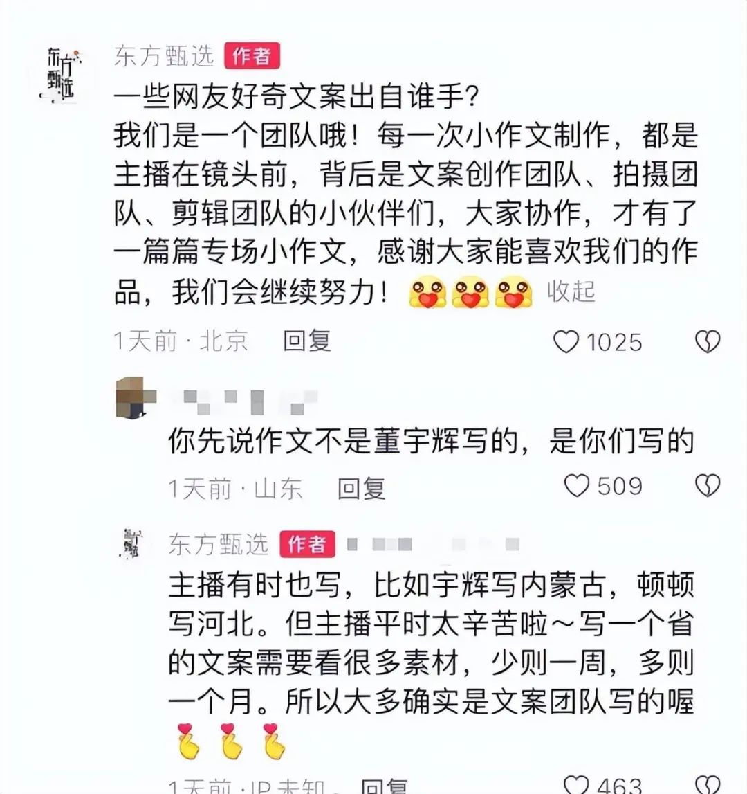 “文案出自团队之手。”12月6日,东方甄选小编在宣传视频下方声称,“每一次小作文制作都是主播在镜头前,背后是文案创作团队、拍摄团队、剪辑团队的小伙伴们,大家协作,才有了一篇篇专场小作文。”小编表示,主播有时也写,比如宇辉写内蒙古,顿顿写河北。但主播平时太辛苦,大多是文案团队写。