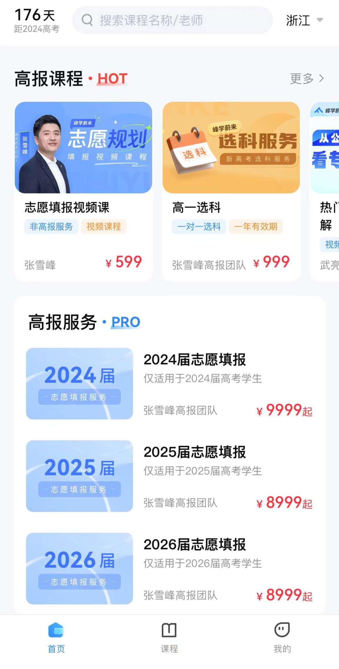 在这些公司中,峰学蔚来目前是张雪峰的主阵地。鲸商下载该应用后发现有几款高报课程,比如61节课、售价599元的《志愿填报视频课》;61节课、售价999元的《高一选科》。当然,也有PRO版本的课程,比如9999元起的《2024届志愿填报》。