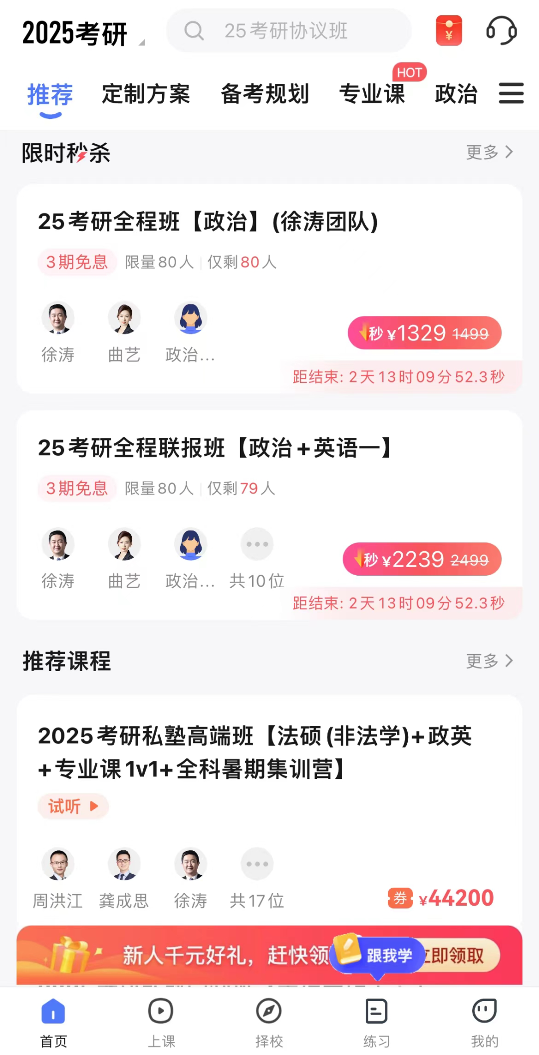除了高考课程,考研考公也是张雪峰的一大业务板块。在APP“研途考研”中,有限时秒杀课程,如1329元的《25考研全程班政治》、2239元的《25考研全程联报班政治+英语一》等产品。
