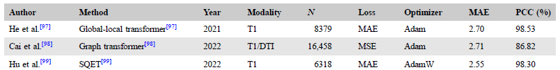 大脑年龄是指对一个人脑部结构和功能相较于其实际年龄状态的评估。通过使用一些神经学和认知学方法,如脑部成像、认知测试和神经生物学标志物,可以估算大脑年龄。估算大脑年龄对于研究认知功能的衰退、神经退行性疾病和其他与年龄相关的神经学问题至关重要。近年来,Transformer已成功应用于大脑结构和年龄之间的建模,为更好理解的大脑健康和老化过程以及开发相关疾病的预防和治疗方法提供了新途径。表格2中总结了大脑年龄预测方法主要的技术细节。