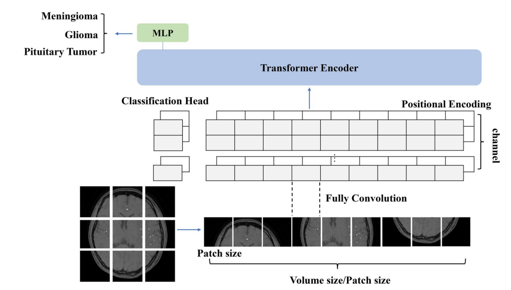 磁共振成像(MRI)*是一种在临床上常用的成像技术,通过对磁共振图像信息进行分析,医生能够发现和诊断脑疾病。Transformer,特别是在计算机视觉中首次引入的Vision Transformer(ViT)图像分类模型,目前已被成功应用于建立复杂的映射关系,如在磁共振图像与脑疾病之间建立关联。自2020年ViT的提出以来,越来越多的研究基于这一框架,致力于肿瘤和阿尔茨海默病等脑疾病的诊断。表格1归纳了以往研究中具有代表性的用于脑疾病诊断的Transformer模型信息。