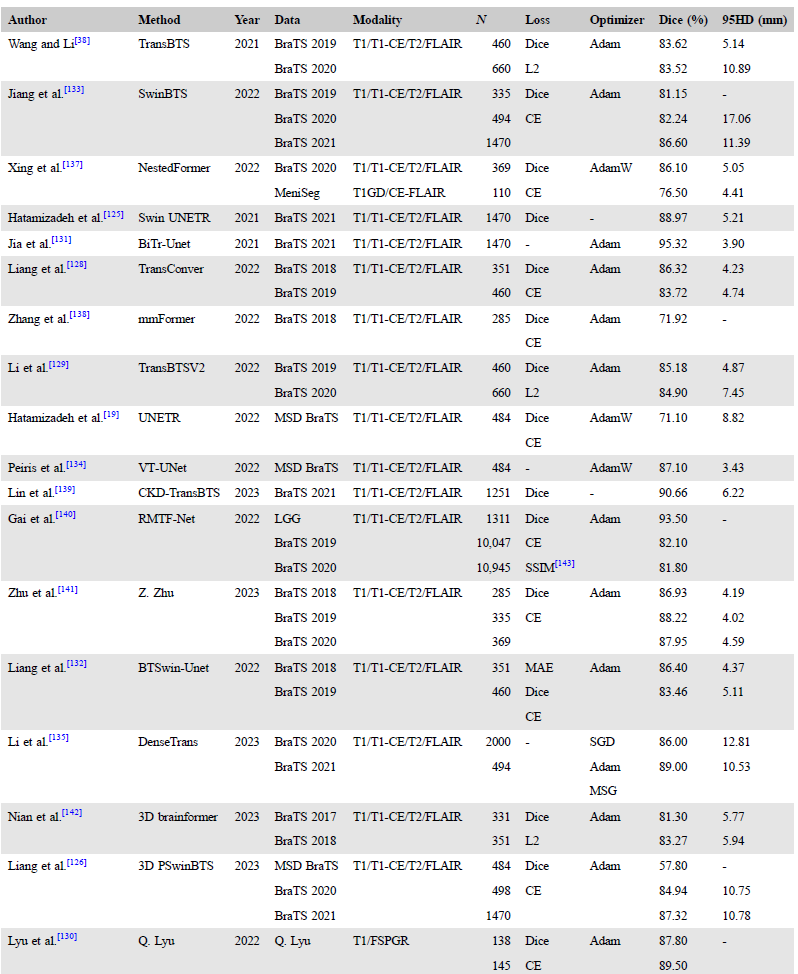 ▷表格3:用于肿瘤区域分割的Transformers的技术细节。图源:参考文献[1]