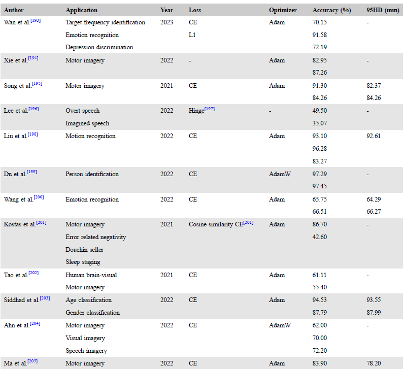 近年来,脑电图(EEG)信号处理也逐渐摒弃传统的基于循环神经网络(RNNs)的方法,转而关注Transformer模型。研究者们引入Transformer模型,如S3T和EEGformer,通过对时空相关性的建模和自注意力机制的应用,为处理EEG信号提供了更灵活、更强大的工具。这些新方法不仅克服了传统方法在并行计算等方面的不足,还为更深入地理解和利用EEG信号提供了前景广阔的研究方向。表格4列举了目前用于EEG数据处理的Transformer的技术细节,供读者参考。