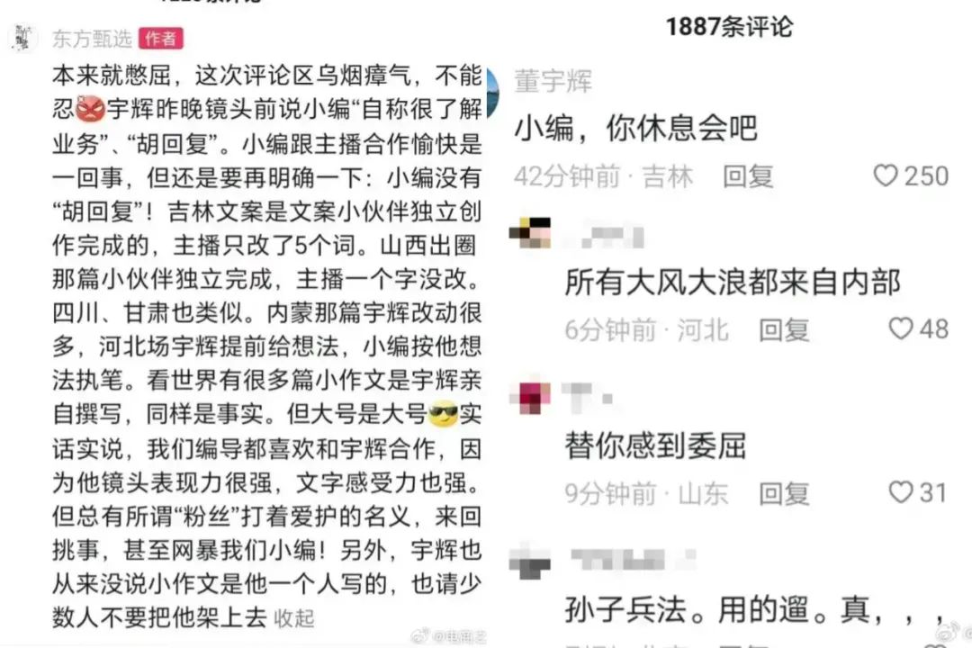 董宇辉从没说过东方甄选出圈的小作文都是由他写的,而东方甄选小编的评论显得像是在跟网友们邀功。