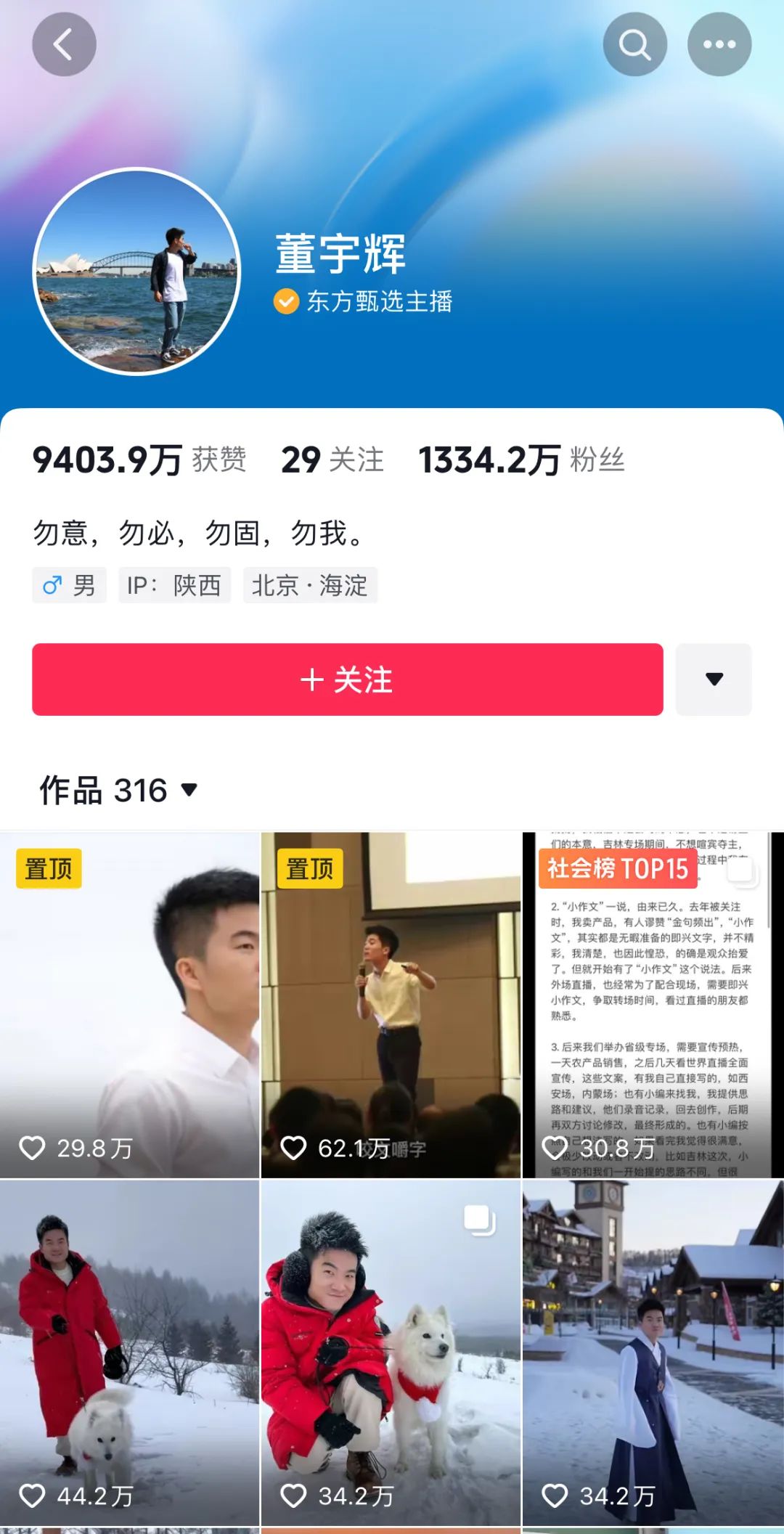 拓品新消费观察到,董宇辉抖音账号的IP地址已经从吉林变成了陕西,简介也从“曾经是老师,现在是售货员”更改为“勿意,勿必,勿固,勿我”。