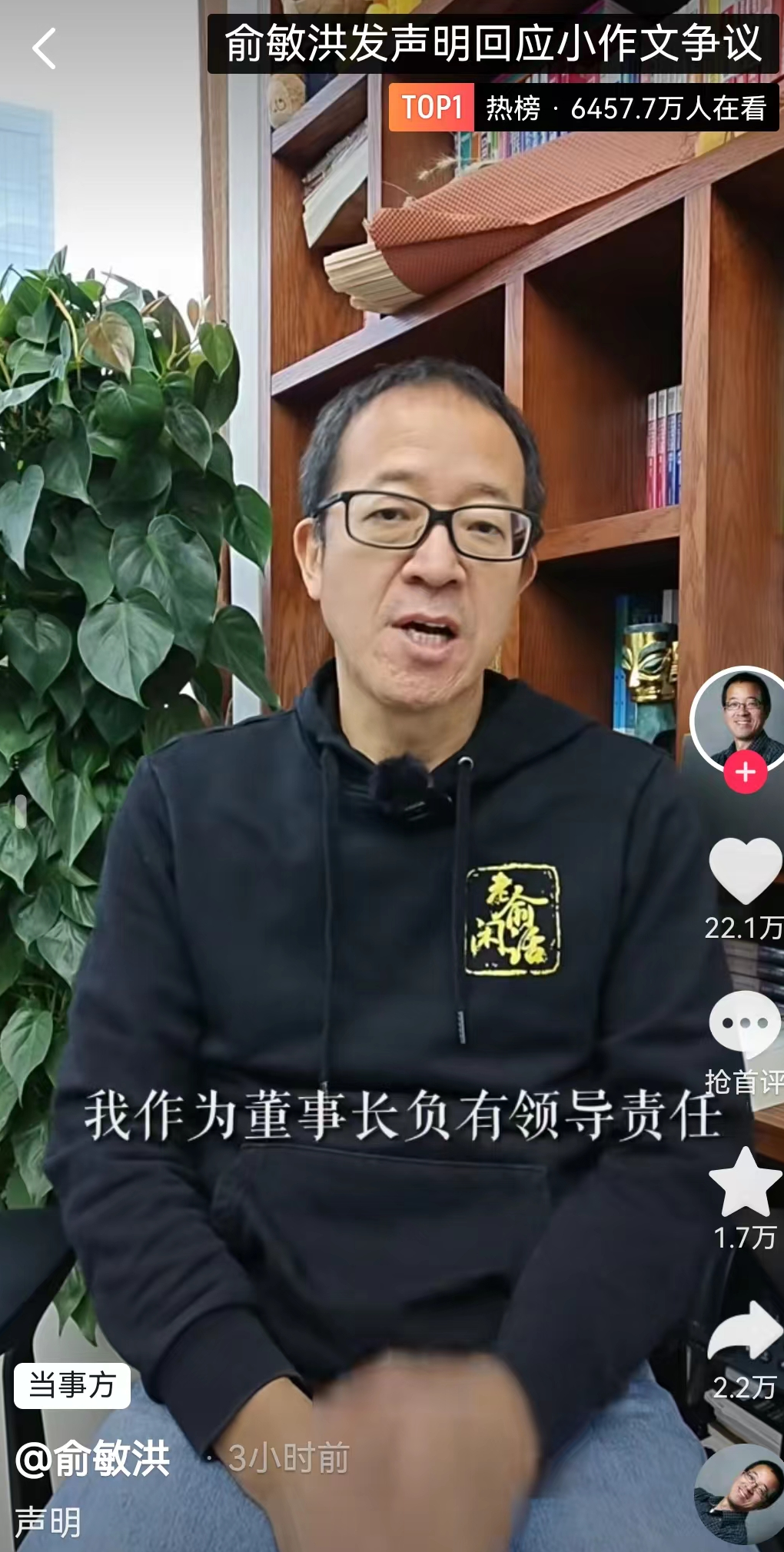 目前最新的进展是,俞敏洪亲自出来发布声明,并特意提到“已经向宇辉表达了歉意”。