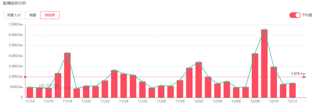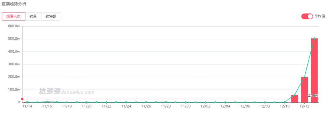 而且,@高途佳品 直播间的观看人数与销售额都在成倍数增长。12月10日前,@高途佳品直播间最高的销售额在10W-25W之间,而在12月13日,@高途佳品 的销售额就达到了250W-500W,是之前的20倍。