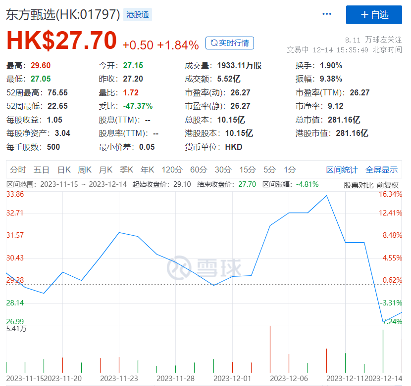 雪球显示,东方甄选的股价已经从12月8日的33.7港元,跌至12月13日的27.70港元,截至发稿前,东方甄选的股价稍有回升,但仍停留在29港元,较之前差距明显。粗略计算,不到4天的时间,东方甄选的市值就蒸发了60多亿港元。