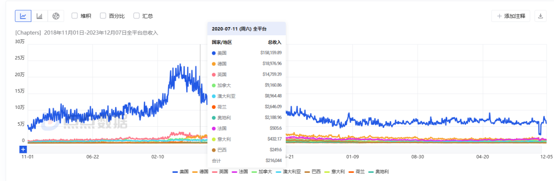 2020年7月,德国一跃成为chapters的第二大营收贡献国 | 图源:点点数据