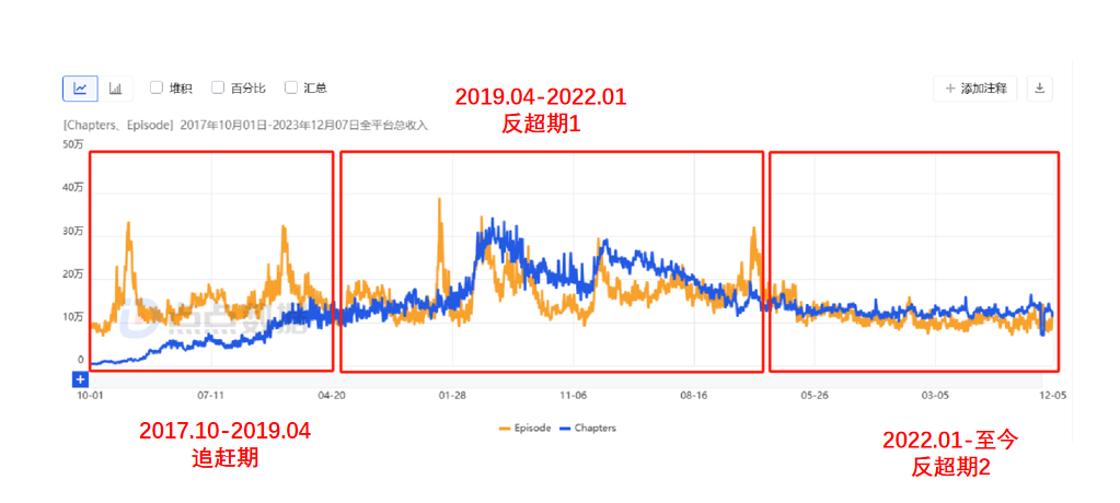 Chapters(蓝色)与Episode(黄色)的全球流水变化趋势 | 图源:点点数据
