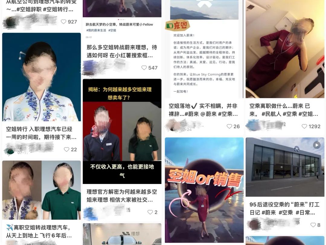 在小红书上搜索关键词“空姐 蔚来”、“空姐 理想”能找到大量图文消息,其中蔚小理居多,前段时间甚至爆出过“空姐转行卖车月入10万”的新闻。