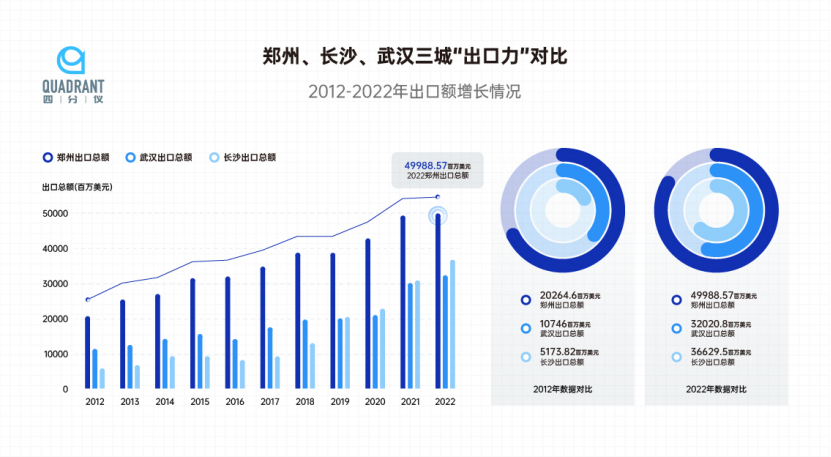 即便对比水路发达的武汉、长沙,郑州的出口数据也有着绝对优势。