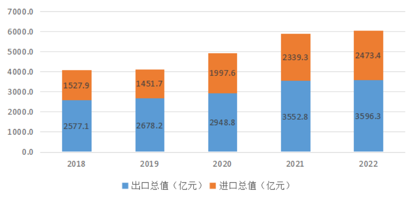 2018-2022郑州出口总值和进口总值 数据来源:郑州统计局