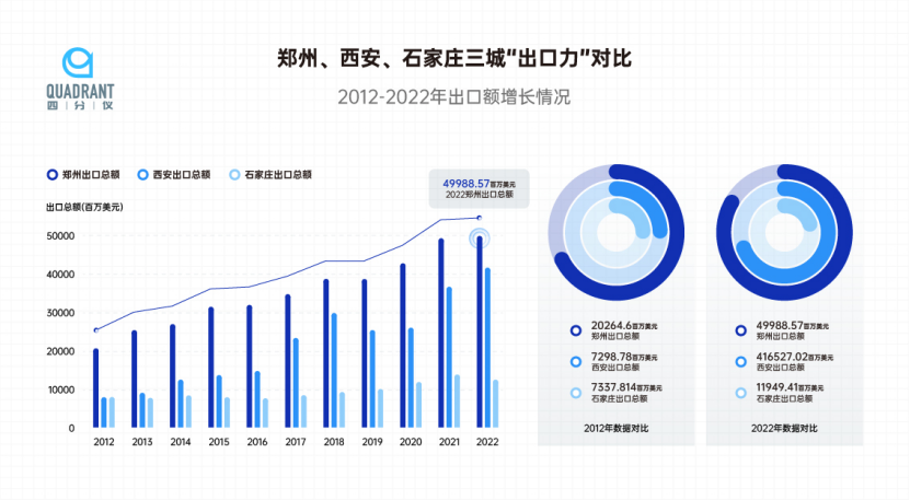 从近十年的数据来看,和同是省会城市的西安、石家庄相比,郑州的出口数据已经担得起“遥遥领先”。