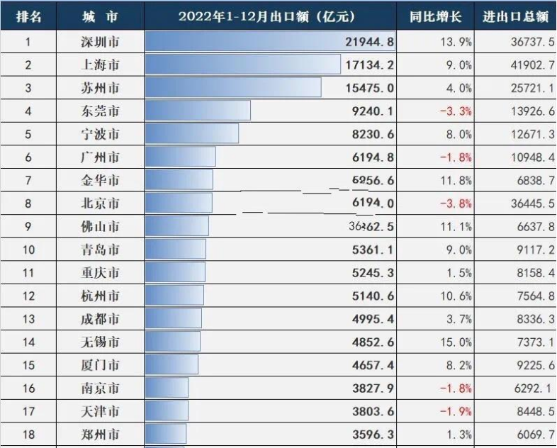 2022年出口额前20城市 数据来源:统计局、海关
