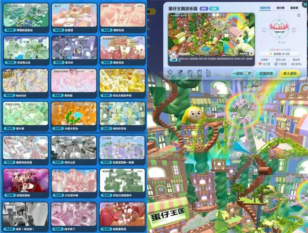 短期来看,它为游戏提供了更多玩法。作为一款休闲类的闯关游戏,《蛋仔派对》无法像MOBA游戏一样,只靠一张地图维持十年。它必须靠源源不断的新内容丰富游戏玩法。乐园工坊的存在,能让《蛋仔派对》拥有玩不完的地图库。