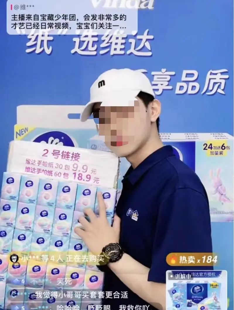 不管是有心还是无意,书亦烧仙草和望山楂的“对打”多少给了其他品牌一丝启发,比如纸巾品牌维达也推出了走青春风的“宝藏少年团”,这些男孩们唱跳俱佳,经常在直播间手举广告牌,并一口一个“姐姐下一单支持一下嘛”。