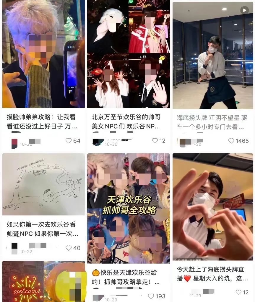 最后,短视频等新兴媒介的迅速发展,给了这些与素人帅哥互动视频快速、广泛传播的技术支持。在小红书上充满了“如何与欢乐谷npc互动”“如何蹲到海底捞男团”等攻略;抖音上也都是与各色帅哥、男模互动的视频。