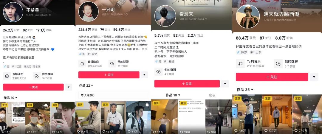 四位“男模”基本都从十一月开始上传海底捞科目三的视频,其中大连商场店的“大连一只明”吸粉最快最多,不到半个月吸粉近五十万,22条视频内容条条点赞过万。个人简介中密密麻麻的直播、练舞、线下演出行程安排,甚至满过一些娱乐圈十八线明星。