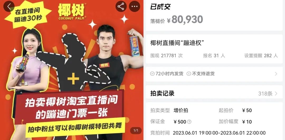 最早开始将男色变为生意的是椰树。在今年3月,椰树开启“猛男直播”,首秀就有近10万人观看,伴随着直播间模特团的走红,椰树还为其准备了线下粉丝见面会,在直播间上架“蹦迪票”,50元起拍,拍中的网友可以和模特团在直播间共舞30秒,最终成交价突破8万元。