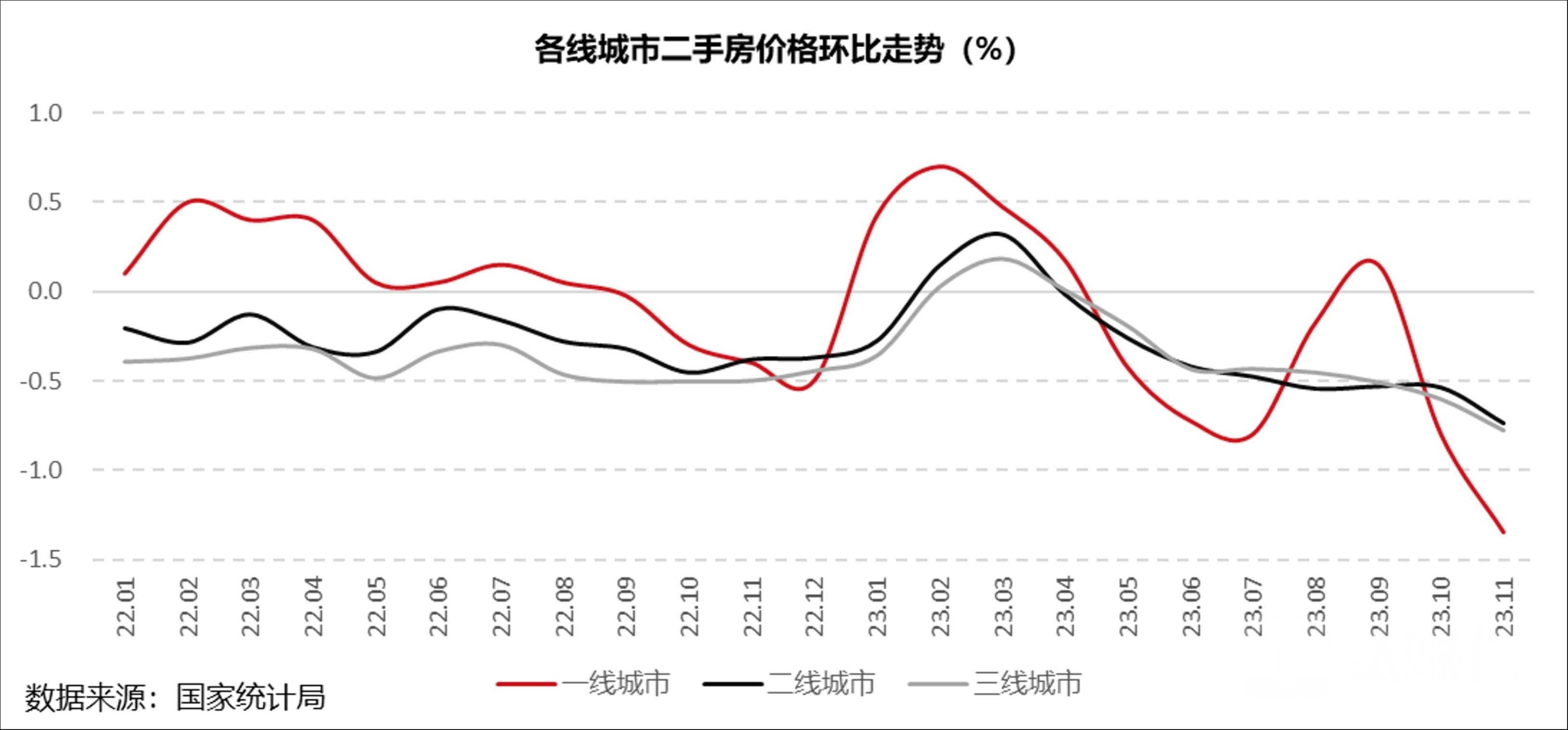 从环比看,11月份,一线城市二手住宅销售价格环比下降1.4%,降幅比上月扩大0.6个百分点,其中北京、上海、广州和深圳环比分别下降1.4%、1.5%、1.0%和1.5%。二、三线城市二手住宅销售价格环比分别下降0.7%和0.8%,降幅比上月均扩大0.2个百分点。