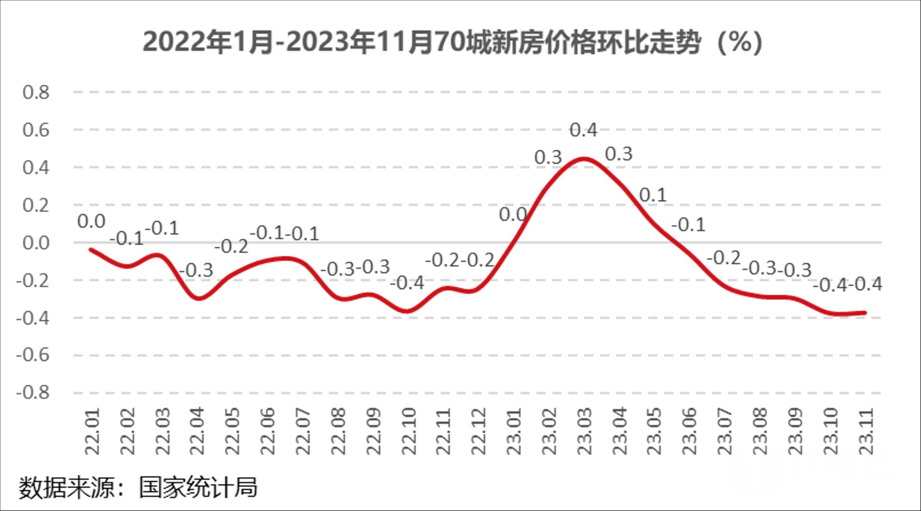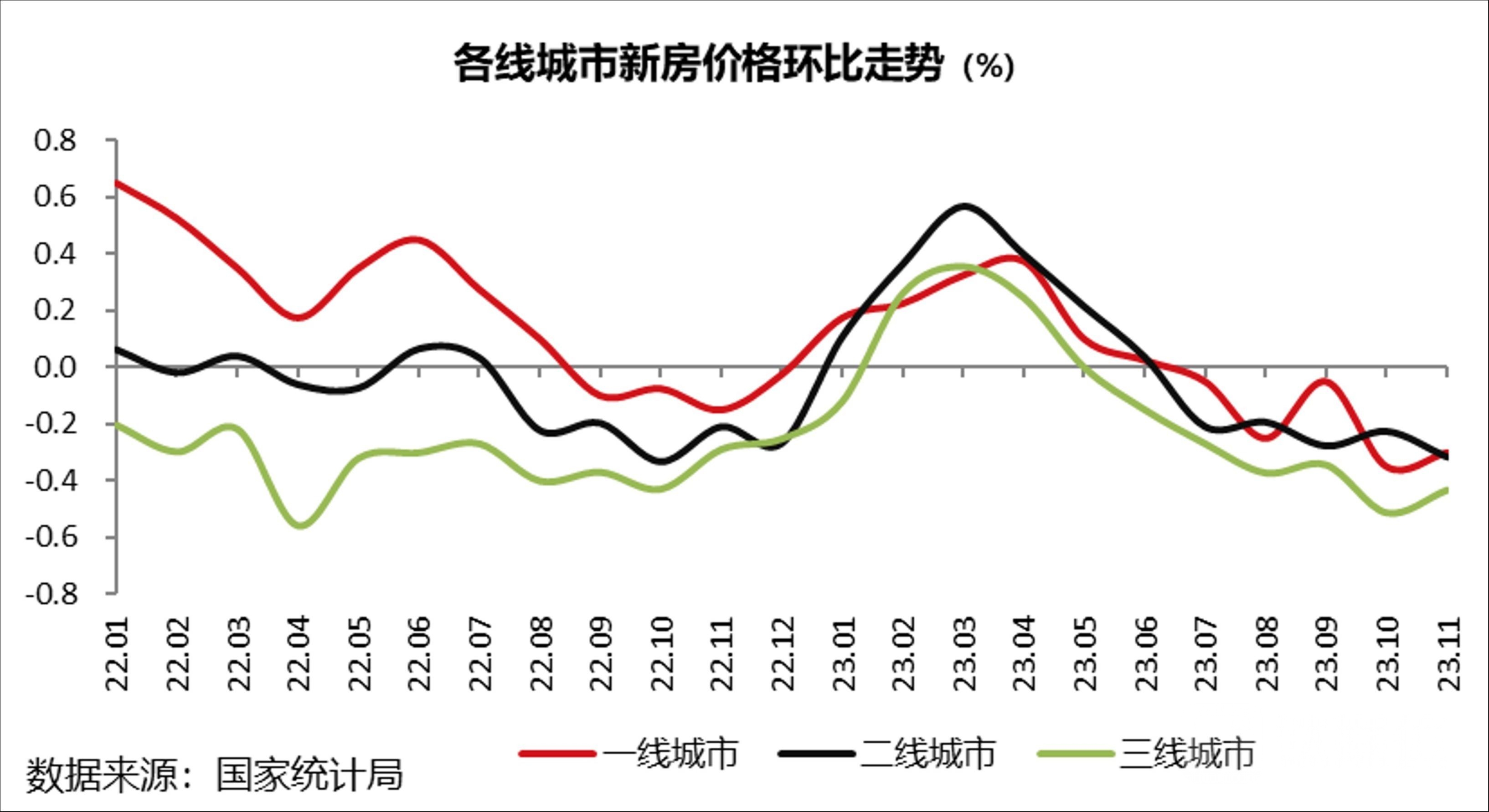 从环比来看,11月,一线城市新房价格环比下跌0.3%,跌幅与10月份持平;二线城市新房价格环比下跌0.3%,跌幅较10月份扩大0.1个百分点;三线城市新房价格环比下跌0.4%,跌幅较10月份收窄0.1个百分点。