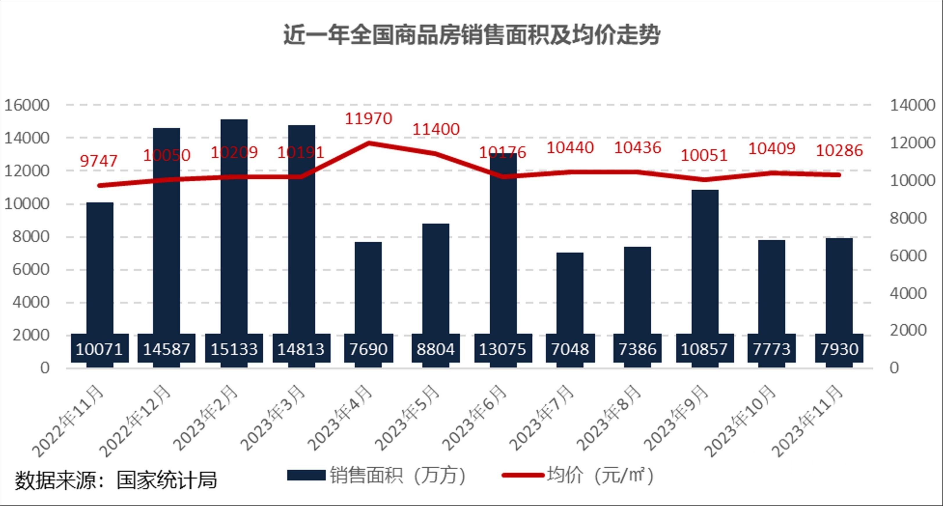 11月,全国商品房销售面积为7930万方,环比增长2%;销售均价10286元/㎡,环比下滑1.2%;销售金额8157亿元,环比增长0.8%。10月,全国商品房销售面积环比下跌28.4%,销售金额环比下跌25.9%。不过,在今年9月份楼市销售端曾出现短暂复苏,当月全国商品房销售面积为10857万方,环比上涨47%,销售均价10051元/㎡,环比下滑3.7%,销售金额为10912亿元,环比上涨42%。