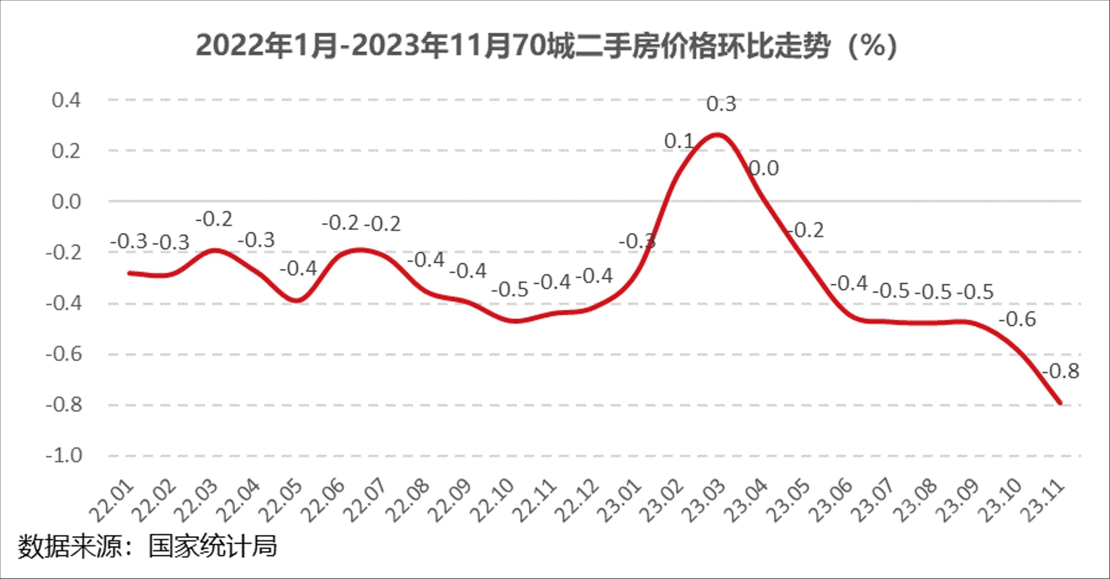 11月,70城二手房价格指数环比下跌0.8%,跌幅较10月份扩大0.2个百分点;同比下跌3.7%,连续22个月同比下跌,跌幅较前一个月扩大0.3个百分点。