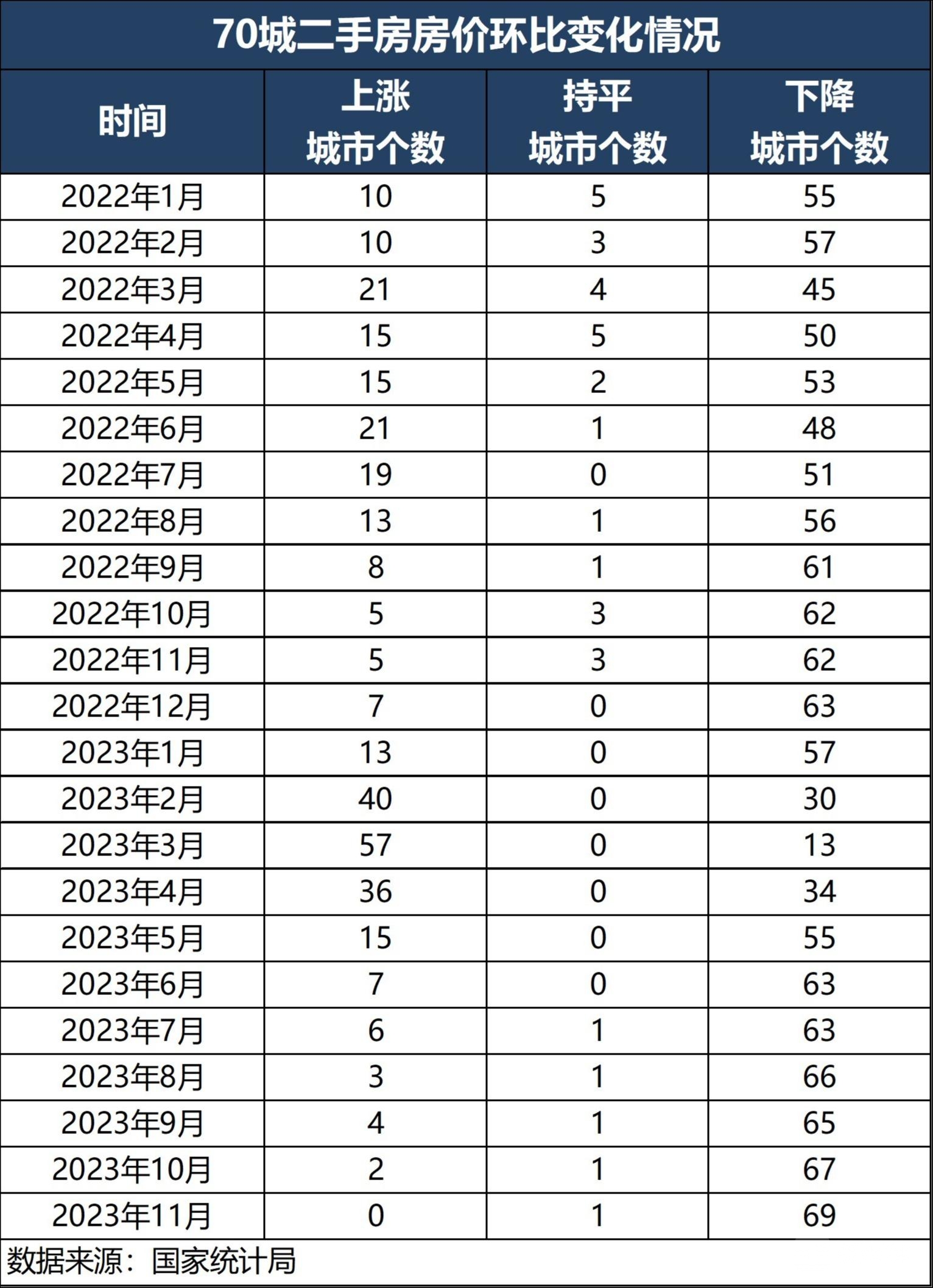11月,二手房价格环比上涨城市数量为0,除杭州二手房价格持平外,其余69城全部下跌。在10月份,杭州和三亚两个城市二手房价格分别环比上涨0.5%、0.1%。