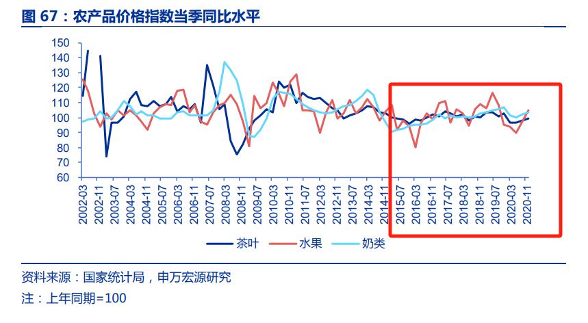 根据农产品价格指数当季同比水平统计来看,自2015年以后,牛奶和茶叶的价格波动性远远小于水果。