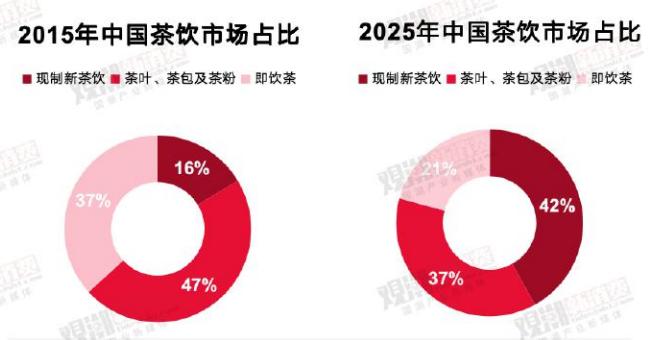 在产业规模和增速方面,同样未来可期。根据《2023年国潮新茶饮产业发展洞察报告》显示,现制新茶饮也将从2015在茶饮市场仅16%的占比到2025年预期提升至42%,超越传统茶叶和即饮茶在茶饮市场规模占比。