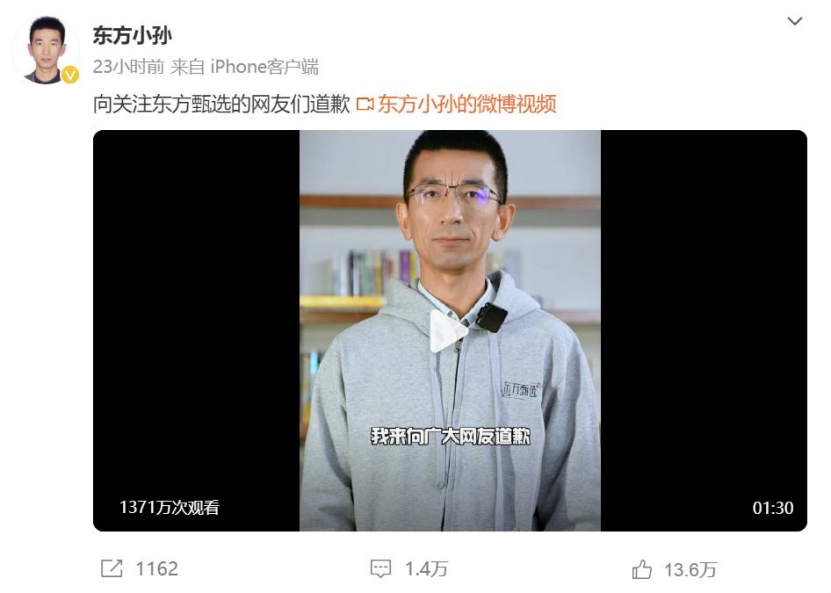 12月14日晚,孙东旭在微博发布道歉视频,对自己近日在直播中神态“咄咄逼人”以及透露董宇辉薪酬等行为鞠躬道歉。