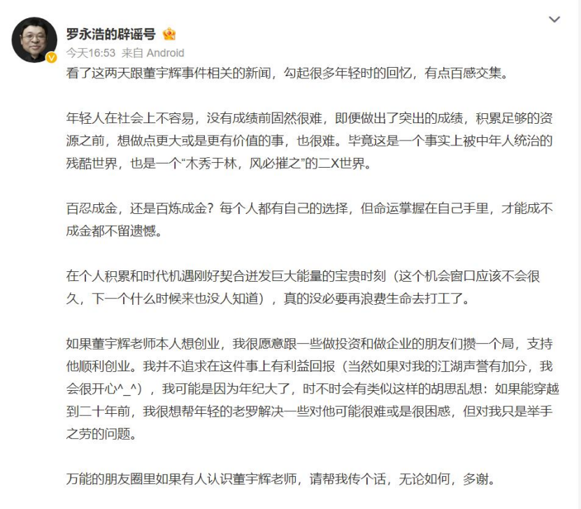 12月15日,罗永浩发消息称:“如果董宇辉老师本人想创业,我很愿意跟一些做投资和做企业的朋友们攒一个局,支持他顺利创业。万能的朋友圈里如果有人认识董宇辉老师,请帮我传个话,无论如何,多谢。”