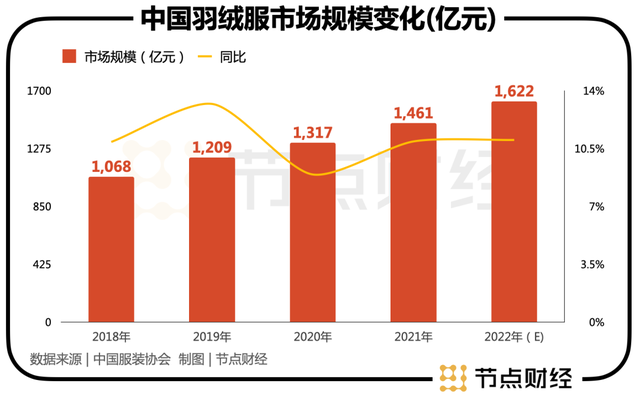庞大的消费人群,叠加近些年羽绒服品牌普遍的提价动作,这让羽绒服市场早在2018年就突破千亿元大关,据中国服装协会数据,2022年我国羽绒服市场规模预计在1600亿元。