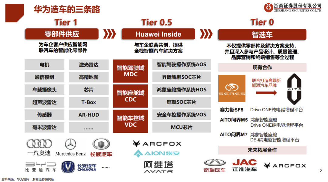 华为准备了三种与车企合作的模式,分别是零部件供应模式、HI模式(Huawei Inside)以及鸿蒙智行(原华为智选模式),华为的参与程度依次变深。其中,零部件供应模式也叫TIre1模式,在这一模式下,车企主要向供应商采购软硬件,华为不提供全套解决方案,这是三种模式中含华量最低的。此时,华为的角色就像手机产业链中的歌尔声学、舜宇光学和汇顶科技,车企就像小米、VIVO,拥有较高的自由度。这是华为TIre1模式与传统TIre1相同的地方。![]()