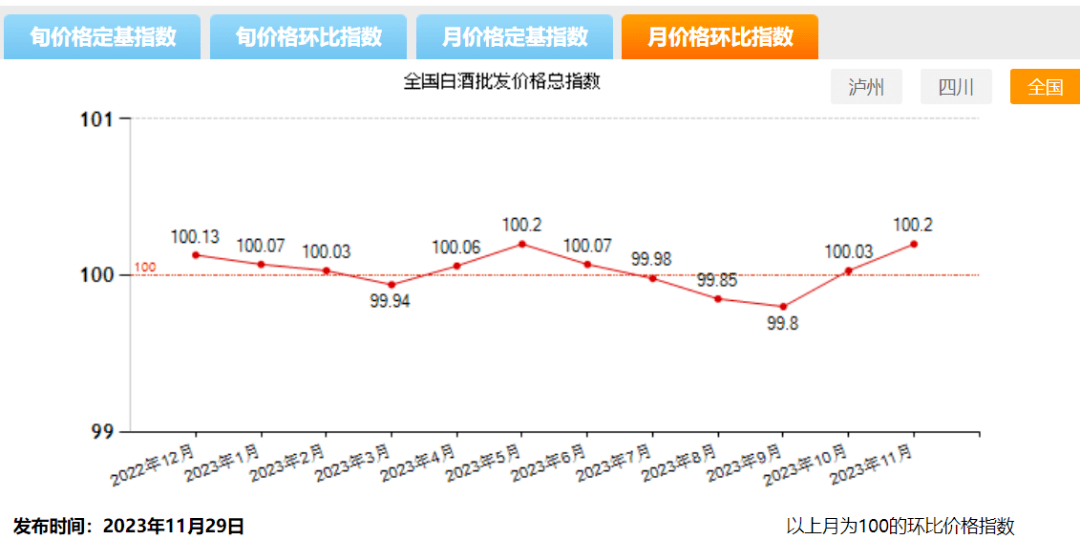 泸州·中国白酒商品批发价格指数官网的数据显示,全国白酒批发价格分别在3月、7月、8月、9月跌破基准线。到了11月,全国白酒环比价格总指数为100.20,上涨0.20%,成为全年增速最快的月份。