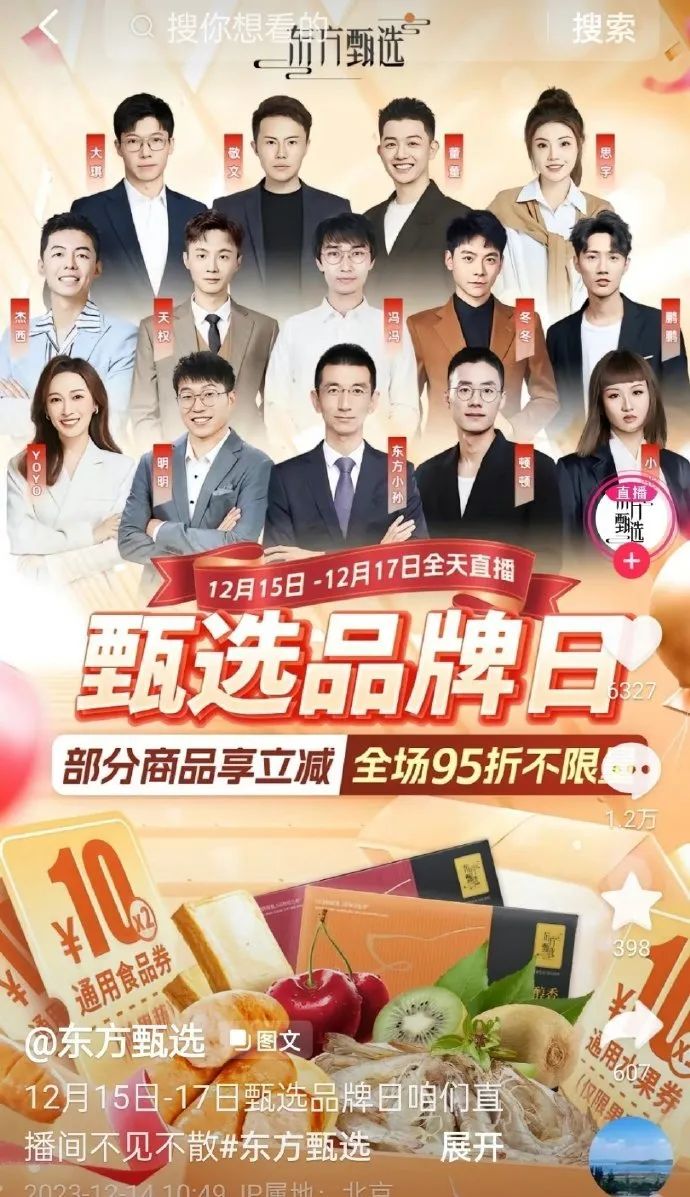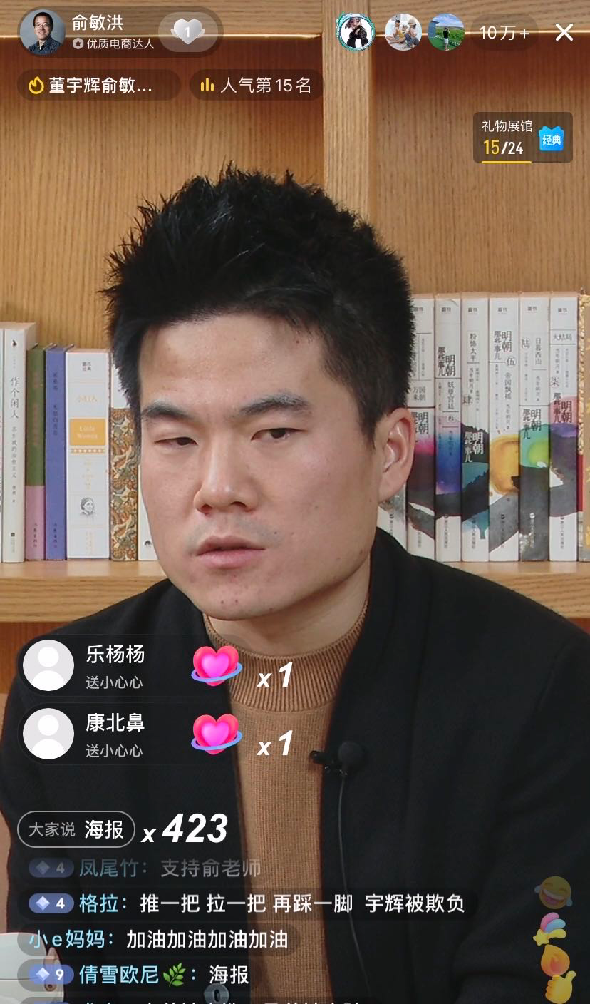 在罢免孙东旭东方甄选CEO职务的同一天晚上,12月16日晚7点,从10日开始消失在东方甄选直播间的董宇辉,出现在了俞敏洪直播间,两人就近期东方甄选“小作文”事件引发的一系列问题进行了回应,当晚有4224万人涌入直播间围观了这场对话。