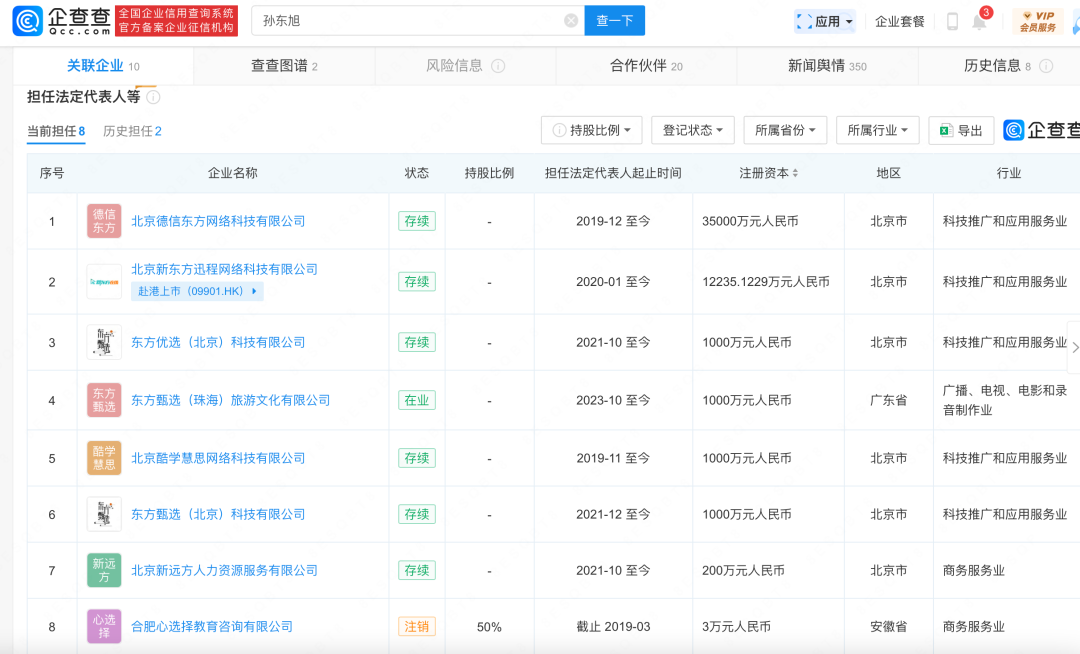 企查查数据显示,目前,孙东旭担任法人代表的企业有8家,其中就有东方优选(北京)科技有限公司,即东方甄选的运营主体,和港股上市公司北京新东方迅程网络科技有限公司。