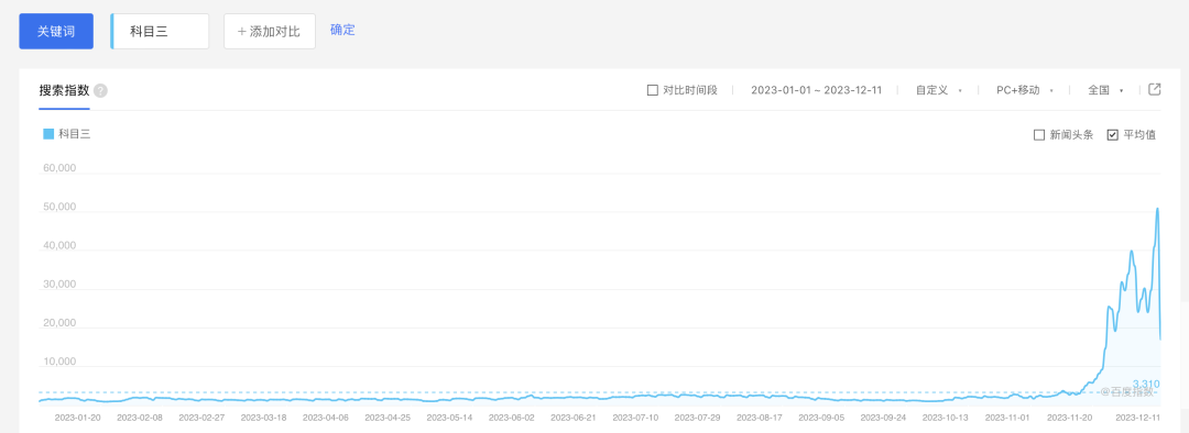 据百度指数显示,2023年11月之前,“科目三”的搜索指数常年维持在3000以下,直到11月底,科目三的搜索指数一路飙升,如今数据大约在40000左右,是此前的10倍左右。科目三舞蹈的爆火,甚至变相地“污染”了驾照考试科目三的信息源,有人吐槽道:“求求你们别再发了,我都找不到科目三教程了。”