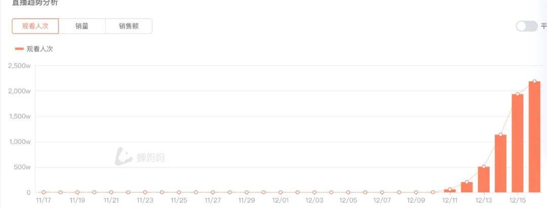 据蝉妈妈数据,12月高途佳品总计涨粉超过100万,直播间在线人数最高达到18万,直播日观看人次从原本的寥寥无几,到12月16日超过2000万人次,直播日销售额也在15日冲上了1200万元。