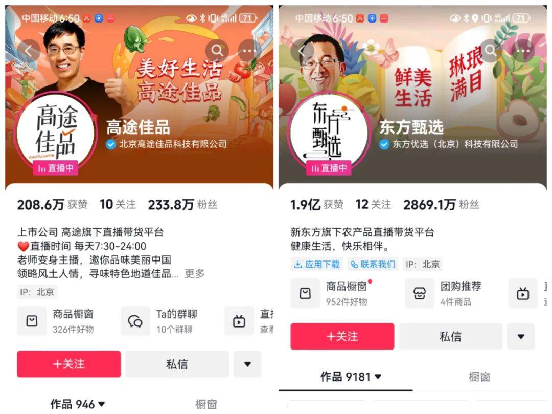 首先,从渠道布局来看,东方甄选不仅在抖音上开设有8个账号,也入驻了淘宝直播,并自行搭建了APP,将社媒流量导向自有平台。而高途佳品则主要经营抖音平台,目前仅有3个账号。