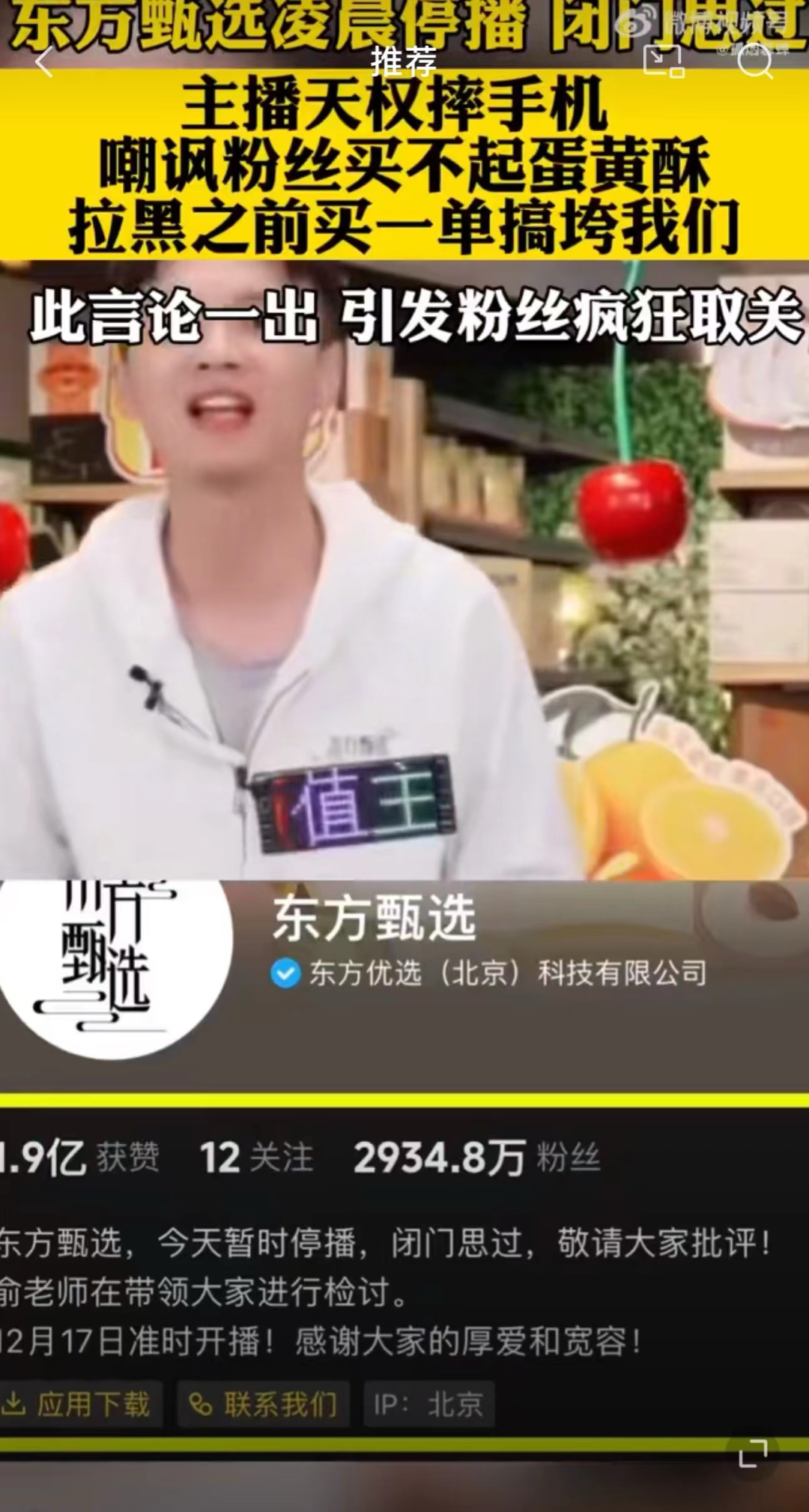 最近的东方甄选几乎处于失控的状态,董宇辉事件还未有妥善的处理,12月15日,东方甄选主播天权再次在直播间“挑衅”用户。在其当晚直播时,不少用户把对于东方甄选的不满在弹幕中发泄,不乏一些人身攻击等过激的言论。