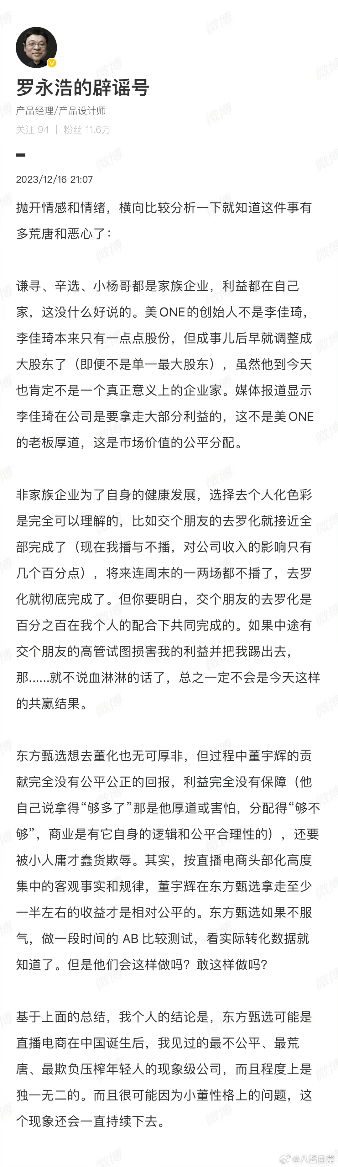 “其实,按直播电商头部化高度集中的客观事实和规律,董宇辉在东方甄选拿走至少一半左右的收益才是相对公平的。”罗永浩在其社交账号表示,董宇辉的贡献完全没有公平公正的回报,利益完全没有保障。