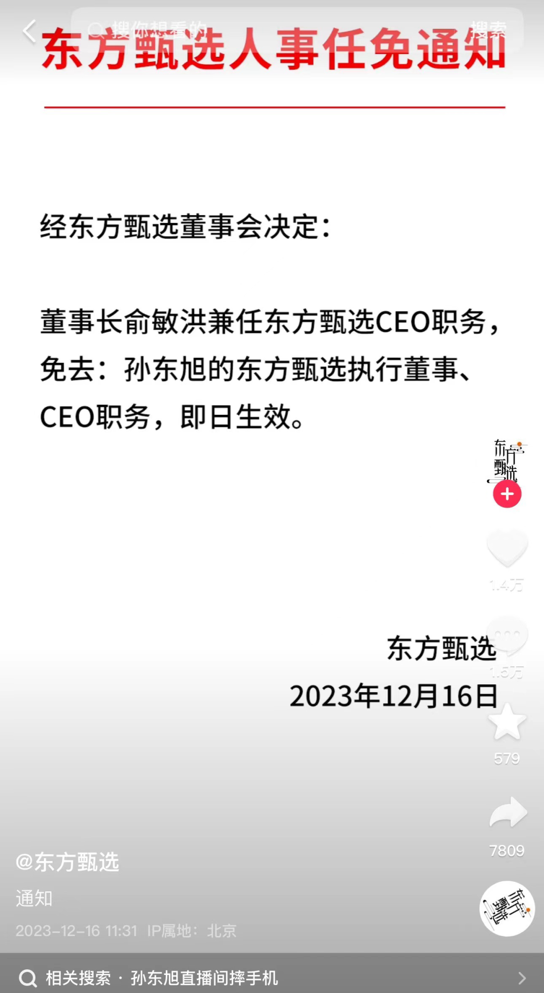 通知显示,“经东方甄选董事会决定:董事长俞敏洪兼任东方甄选CEO职务,免去:孙东旭的东方甄选执行董事,CEO职务,即日生效。”