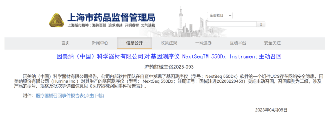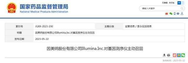 记者发现,和海普洛斯合作的因美纳,今年已经在不到两个月的时间内被国家药监局和上海市药监局接连发函,要求召回相关产品。原因都出奇一致——其设备存在网络安全隐患。另外在2022年,因美纳也出现过两次“召回门”事件。