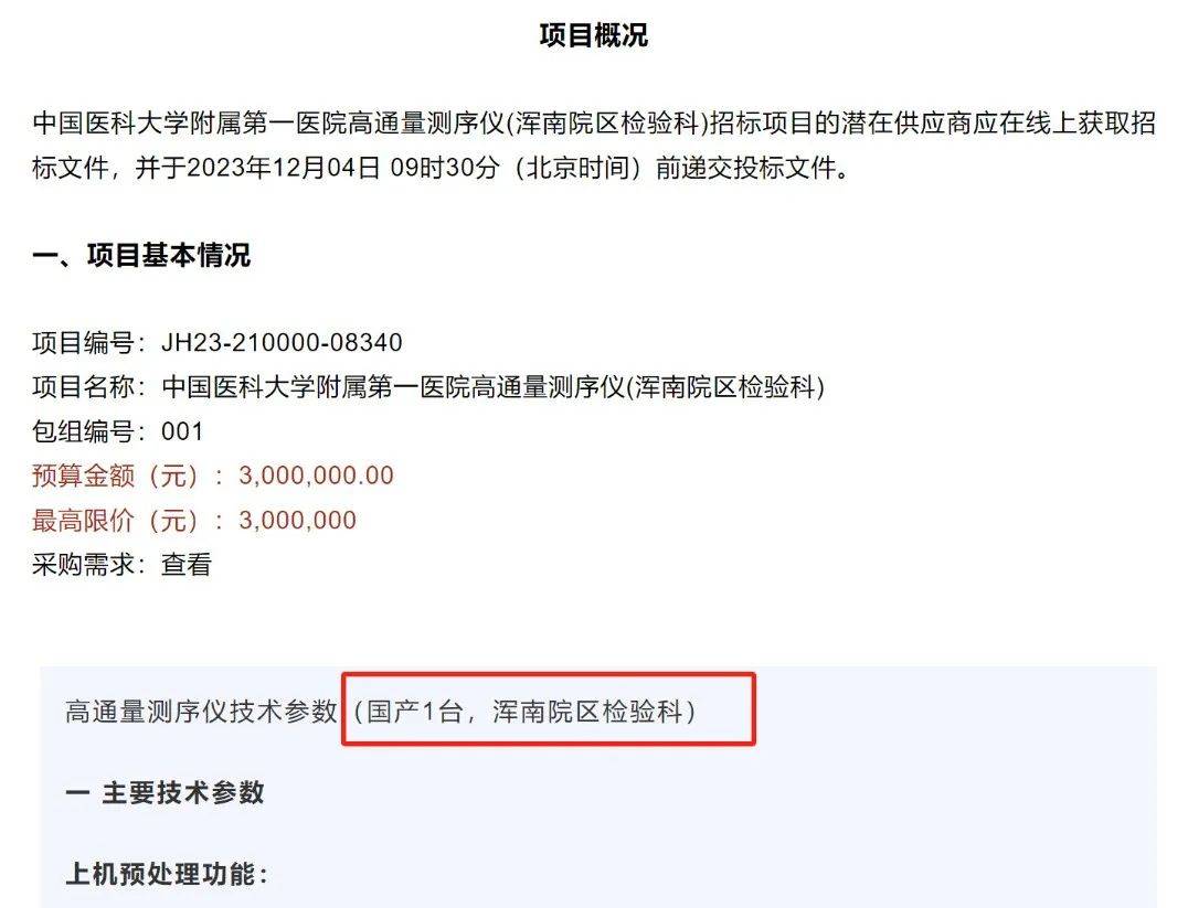 「界面新闻·子弹财经」翻看最近的招标公告发现,辽宁省政府采购中心发布【中国医科大学附属第一医院高通量基因测序仪(浑南院区检验科)】的招标公告,明确要求是国产。